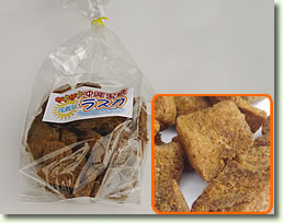 特徴・・・ラスクに良く合うパンドミー食パンを使った一口サイズのラスクです。沖縄の黒糖とマーガリンの相性がバッチリで、1つ食べたらもう1つ、また1つとついつい食べ過ぎてしまうかも?